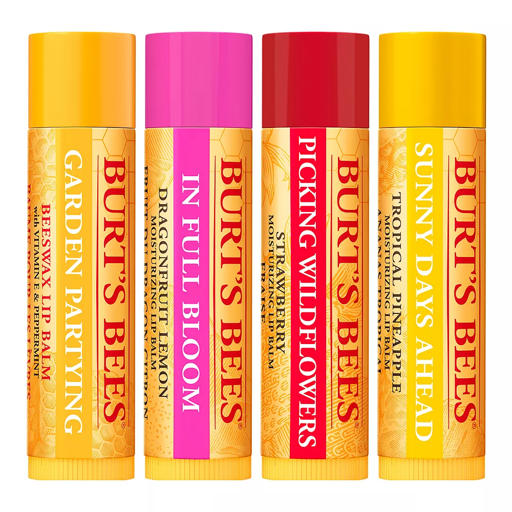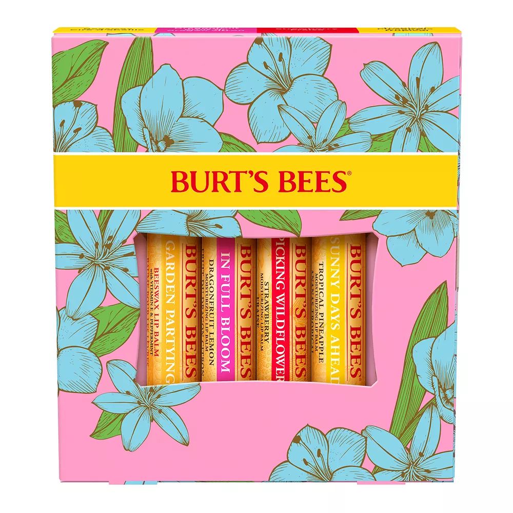 - Burt’s Bees In Full Bloom Lip Balm Gift Set contains four handy tubes of Burt’s Bees naturally moisturizing lip balm in four flavors: Beeswax, Dragonfruit Lemon, Tropical Pineapple and Strawberry, and each tube features a spring-inspired phrase!