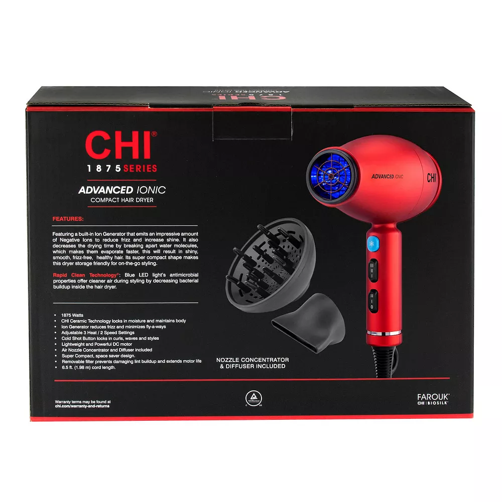 CHI 1875 Series Advanced Ionic Compact Hair Dryer features a built-in Ion Generator that emits an impressive amount of Negative Ions to reduce frizz and increase shine, all while decreasing drying time.