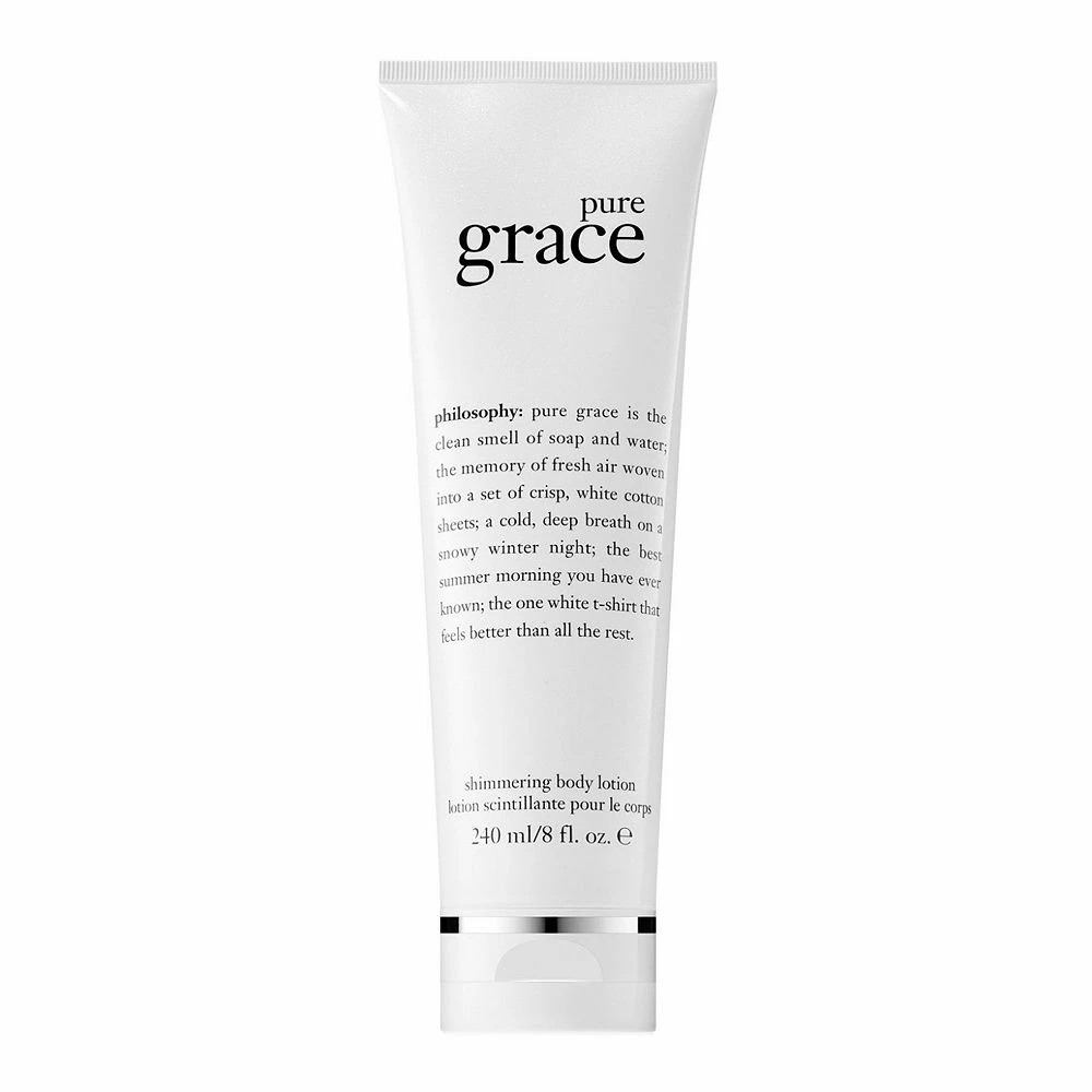 Fragrance Description: This philosophy Pure Grace skin-loving, fast-absorbing, nourishing body lotion is infused with the beloved soap-and-water-clean scent, and added a graceful touch of shimmer for a subtle, summer-perfect finish.
